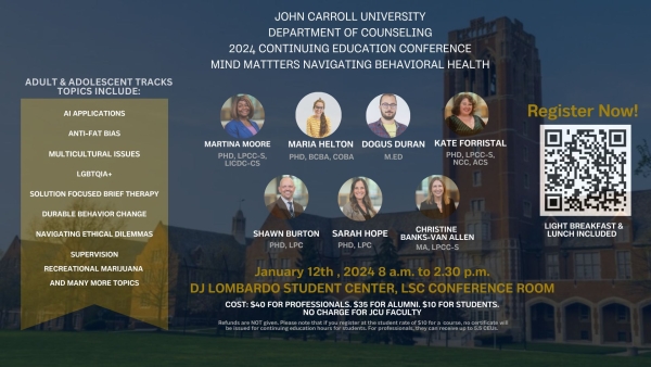John Carroll University Office of Continuing Education is an approved provider for the Ohio Counselor, Social Worker, and Marriage and Family Therapists Board (provider #RCS030604 and #RTX091802). John Carroll University has been approved by NBCC as an Approved Continuing Education Provider, ACEP Number 4064. Programs that do not qualify for NBCC credit are clearly identified. John Carroll University is solely responsible for all aspects of the programs. CE hours are also available for nursing professionals–the Ohio Board of Nursing recognizes educational activities that have been approved for other disciplines. John Carroll University is approved by the Ohio Psychological Association – MCE Program to offer continuing education for psychologists. John Carroll University [tax id: 00PO-340714681], maintains responsibility for the program. John Carroll University is an approved course provider for the Ohio Chemical Dependency Professionals Board (50-21692.)